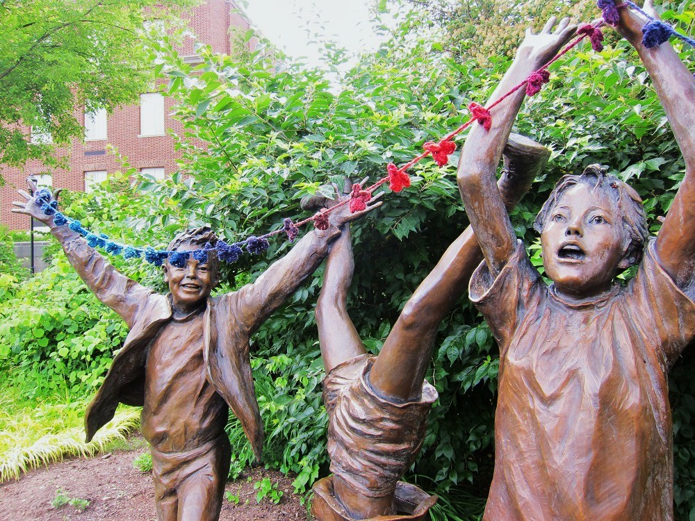 In general it’s my feeling that good statues need no enhancement from the likes of me, so I took the garland down after taking the photos, and am still trying to decide where to put it. I had hoped to find a home for it somewhere in State College, but I slept too late Monday morning. Rats!