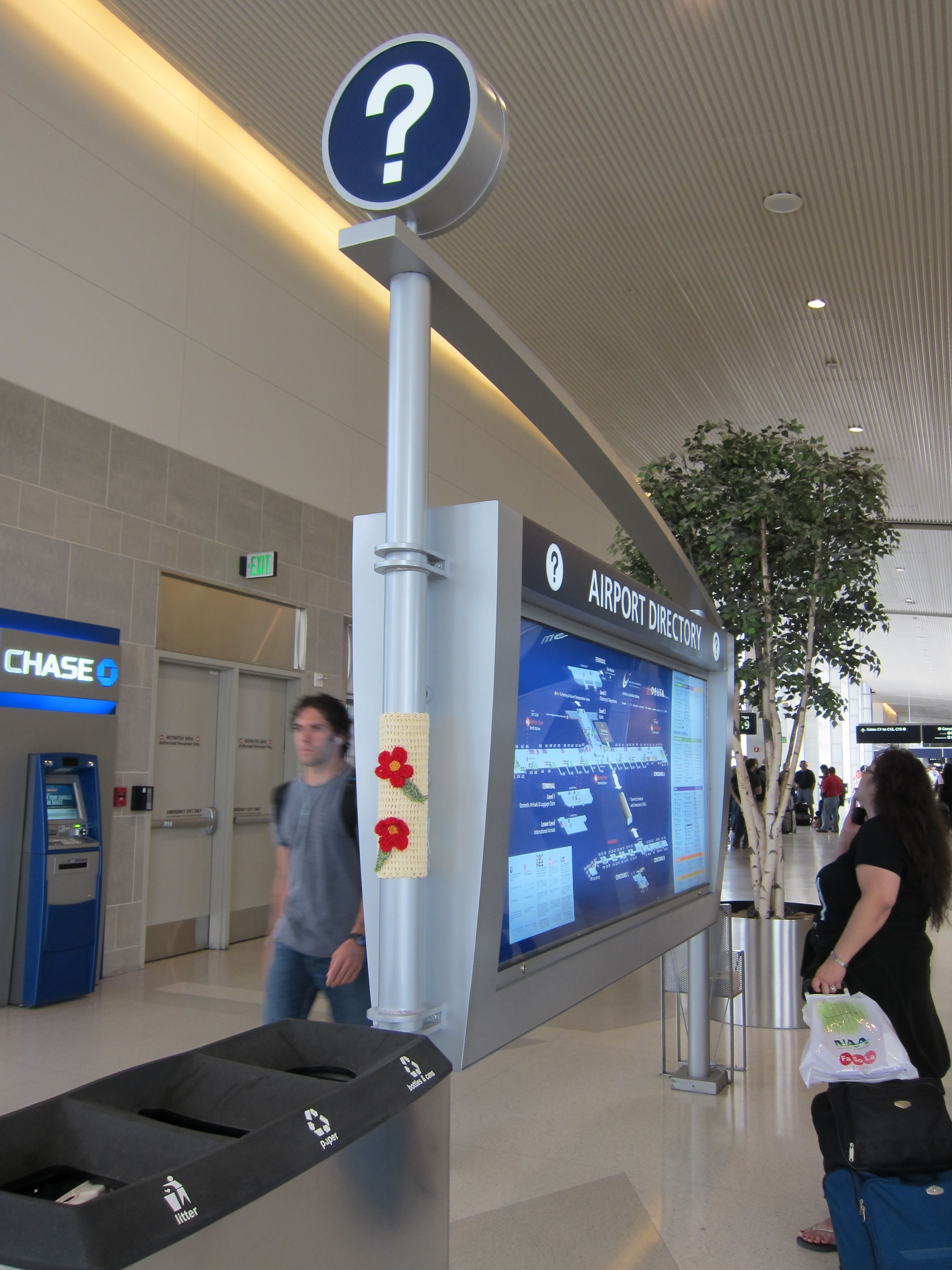 So anyway, I’m traveling with my sweetie, visiting his parents on the occasion of their 50th wedding anniversary, and we were passing through the Detroit airport with loads of time to fill waiting for our connecting flight. I put a little crocheted piece up on a pole, and a woman watched me while I was working. I looked over and smiled at her, and she asked me about what I was doing. I couldn’t place her accent, but some kind of European. Was I getting paid to do it? No, it’s just something I like to do. Sort of a gift to the airport, then? Yes, I suppose, or at least I hope people see it that way! Won’t someone steal it? Maybe. Sometimes my pieces stay up for a long time and sometimes they don’t. At any rate, it will be interesting to see if it’s still there on our return. If you happen to be passing through the C terminal, it’s near gate C18. Let me know!