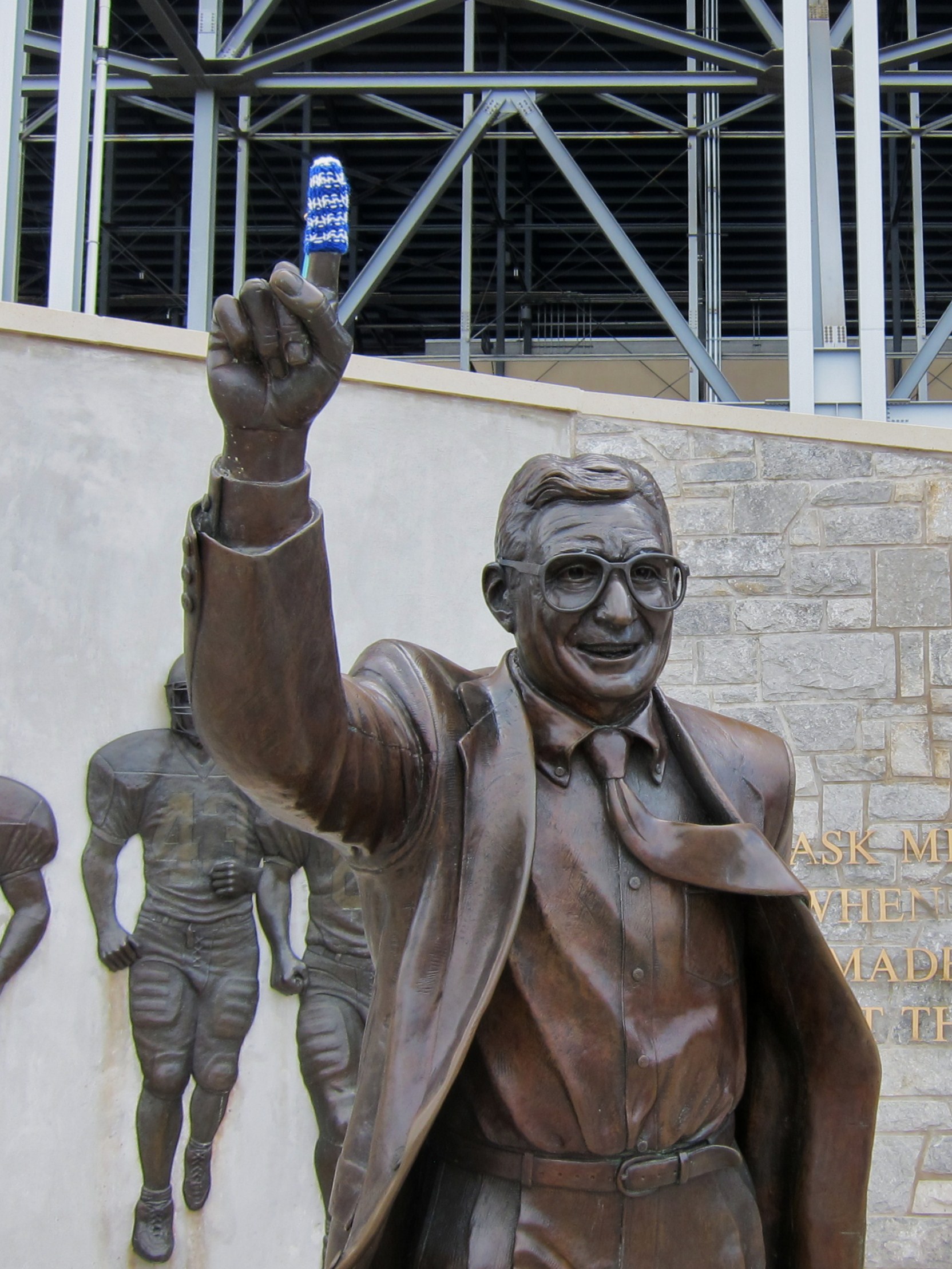 Back from Pennsylvania, where my sweetie’s folks very much embraced the idea of adorning Penn State’s statues with whimsical knittany, if only briefly. First up was what I initially heard as “the Joe Pistachio” but actually turned out to be “the Joe-Pa statue.” So sue me, I’m a new initiate to the strange world of college football.