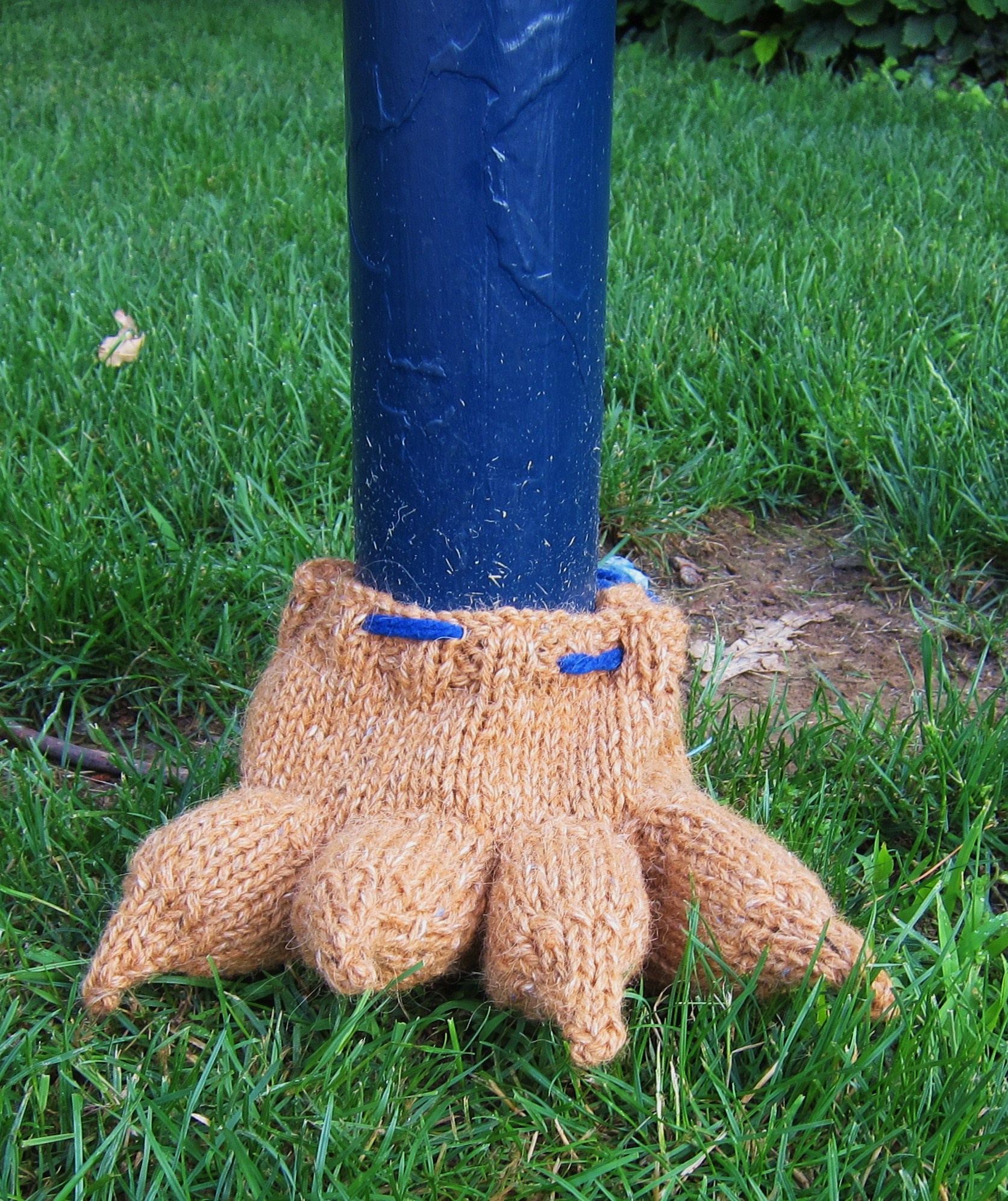 At any rate, I made some more lion toes and an ankle, for a variation on the ever-popular monster foot, and placed it at the base of the sign near the statue that explains its history, and cast off the blue and white piece and wrapped the signpost with it: