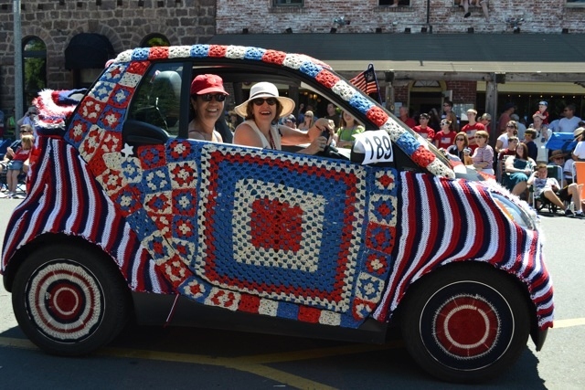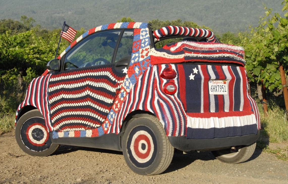 Finally getting around to some long overdue updates! First of all, I was invited to participate in a group project for the Sonoma 4th of July parade, seven of us collaborating to cover a Smart car with red white and blue knit and crochet. I got to do the hood and front bumper, for which I made a flag, a smile, and a few fill-in bits. I wasn’t able to attend the parade, but here are some photos: