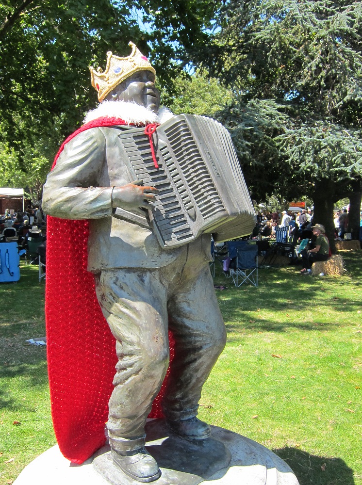 It’s Accordion Festival time here in Cotati, California, and the day I’ve been preparing for ever since I realized I couldn’t finish this piece in time for IYBD. I bring you the Jim Boggio statue, dressed as the King of the Stomach Steinway: