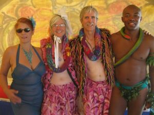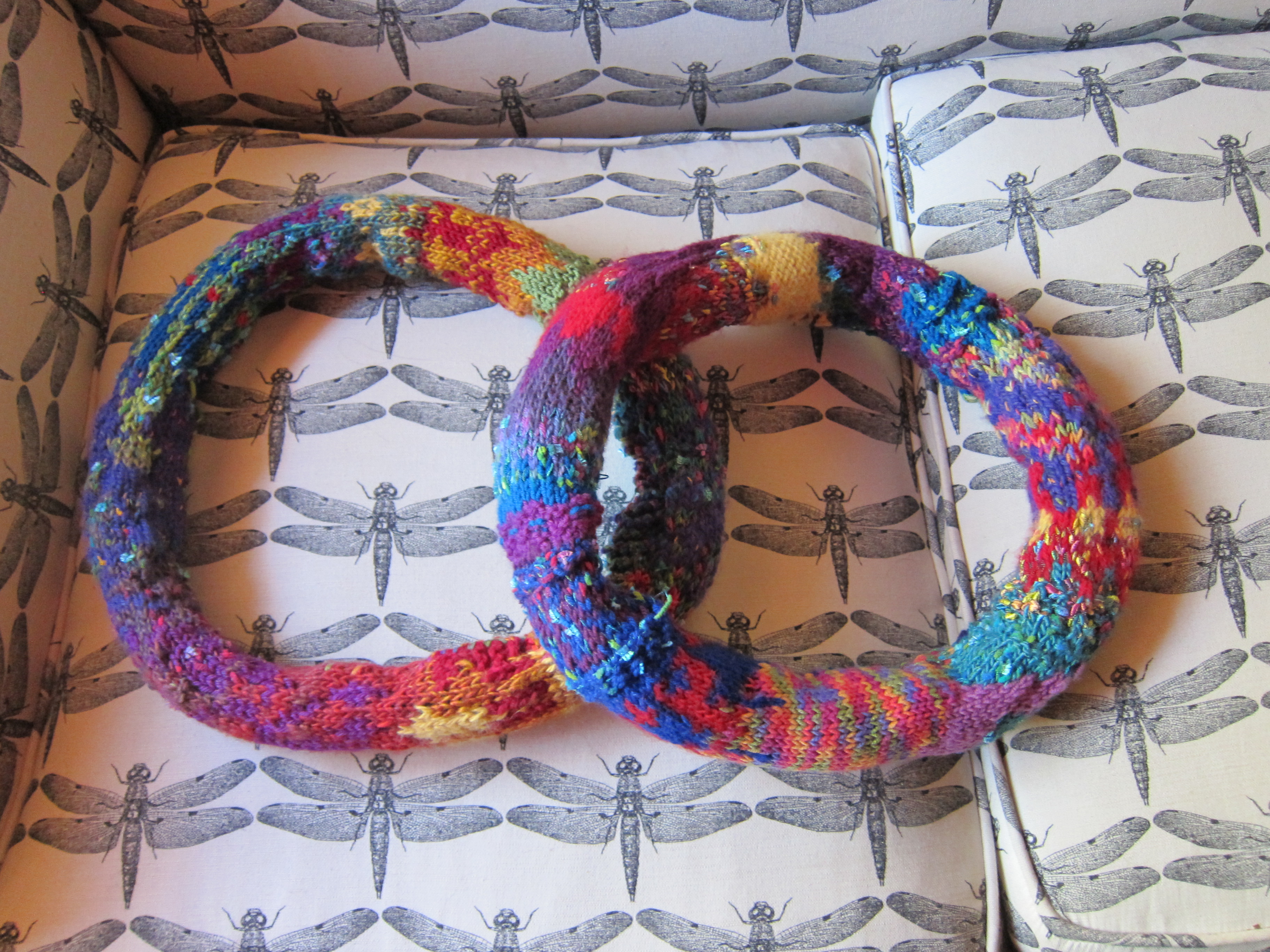 I guess it’s a stretch to call it yarn bombing, but I was, in a sense, able to yarn bomb a Burning Man wedding this year, courtesy of friends Hugh and Anila, who asked me to knit wedding “rings” for them to put around each other’s necks for their ceremony on the Playa. I was given very general instructions and free rein, and was told the results are exactly what they’d pictured….